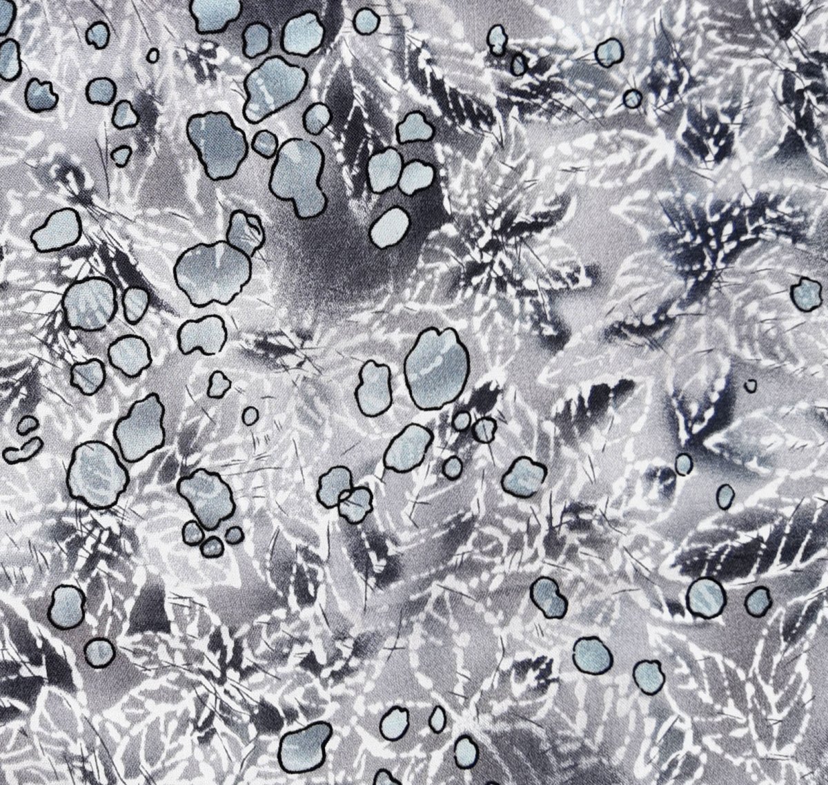 Fond gris argenté mêlé de feuillages clairs et de taches bleu pâle bordées de noir, formant un motif végétal irrégulier et contrasté.