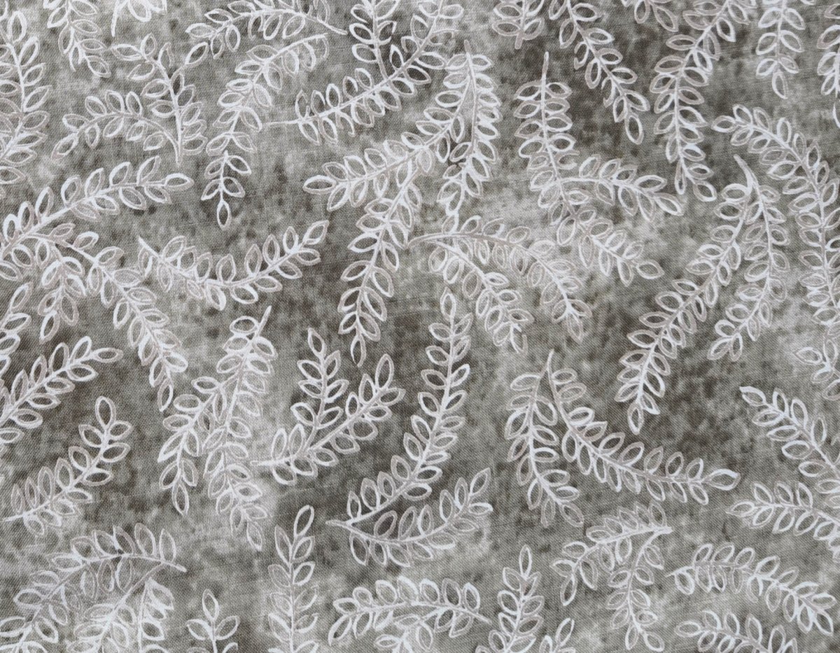 Fond taupe clair orné de branches feuillues blanches dessinées en contour fin sur toute la surface.