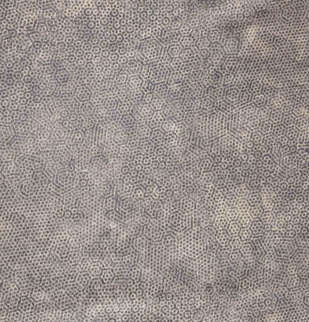 A00041 – Un maillage de petits cercles gris et beige se déploie comme une trame ancienne aux reflets pierre. L’ensemble crée une impression d’équilibre et de matière naturelle.