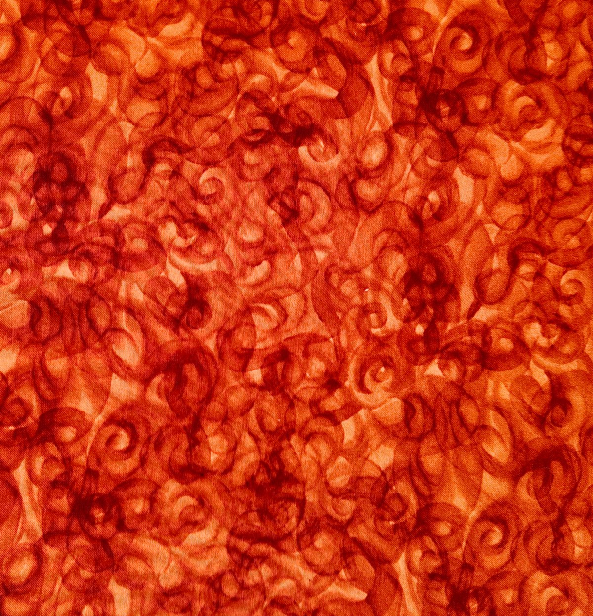 A00052 – Des volutes rouges se déploient en spirales sur un fond orangé, dessinant une surface vivante et en mouvement. Ce tissu respire la chaleur et la vitalité.