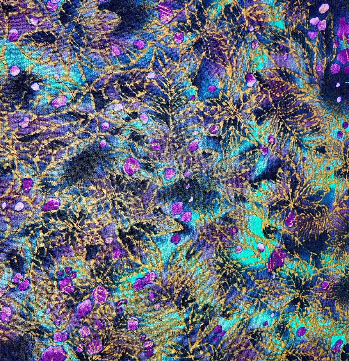 A00132 – Des feuillages dorés et violacés se mêlent à des éclats turquoise, formant une jungle lumineuse et mystérieuse.