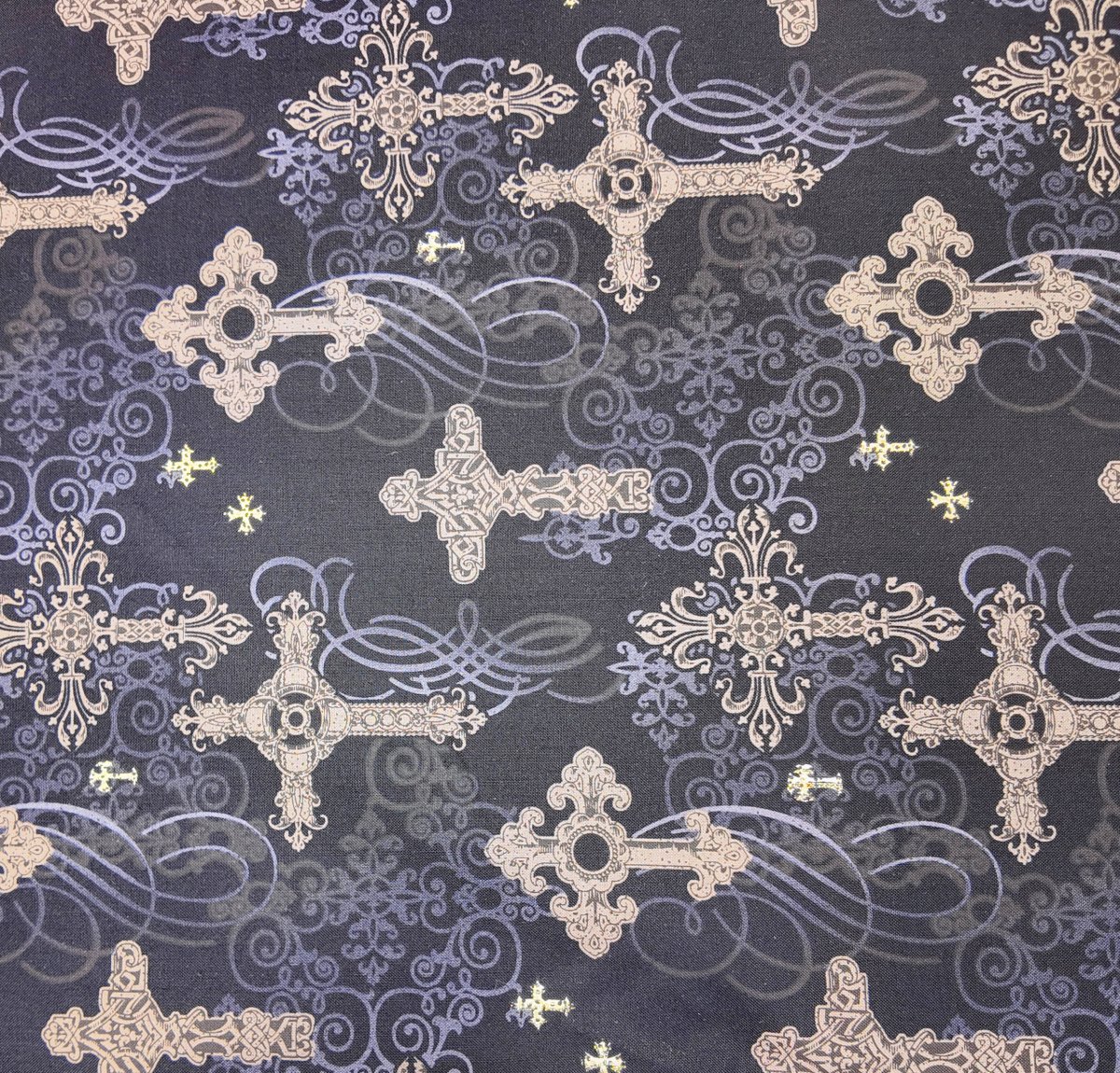 A00287 – Des croix finement ouvragées se déploient sur fond noir bleuté, ornées d’arabesques et de touches dorées discrètes.