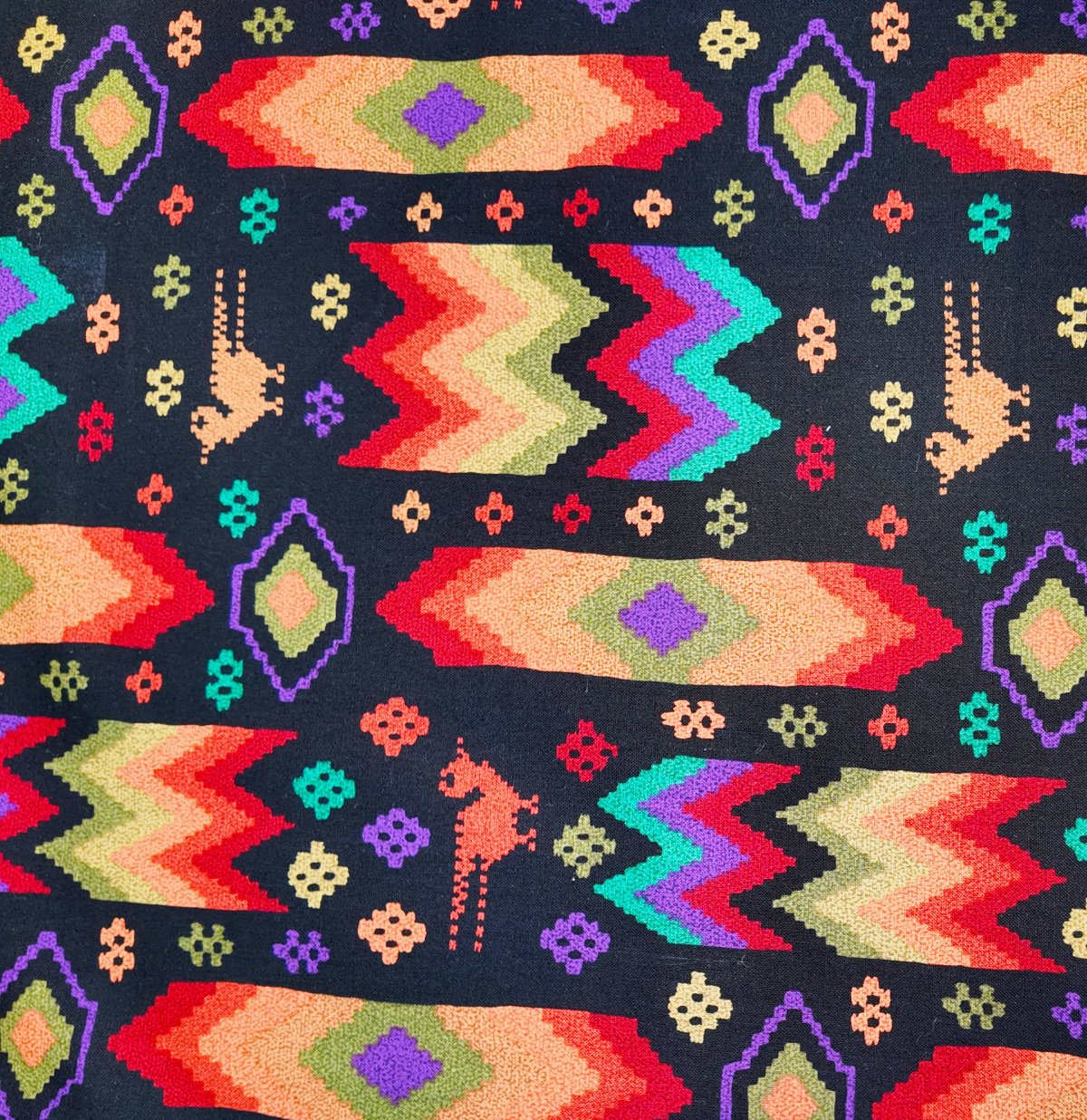 A00294 – Des chevrons flamboyants en orange, vert et violet se détachent sur fond noir, accompagnés de motifs andins stylisés.