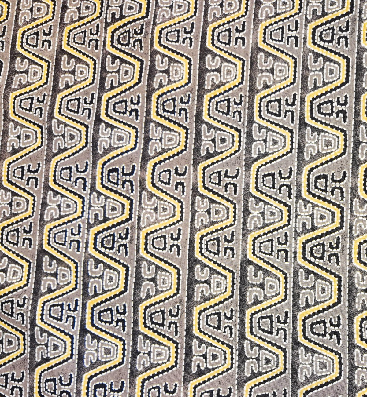 A00295 – Des lignes en zigzag ocre et grises forment une trame géométrique dense inspirée des tissages tribaux.