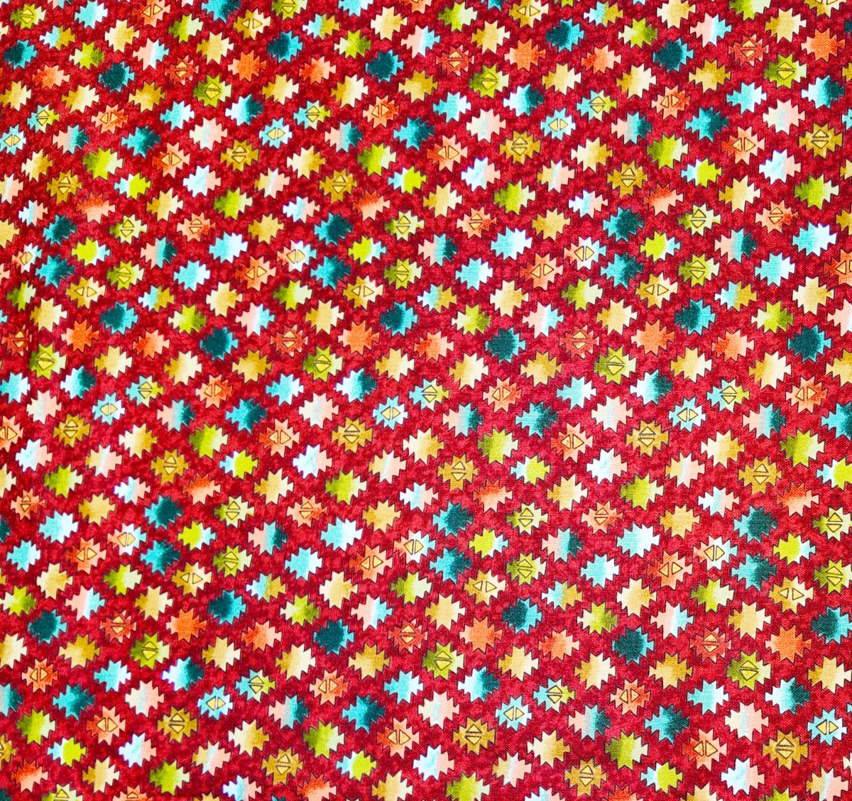 A00296 – De petites formes étoilées turquoise, vertes et orangées se détachent sur fond rouge, comme une mosaïque en mouvement.