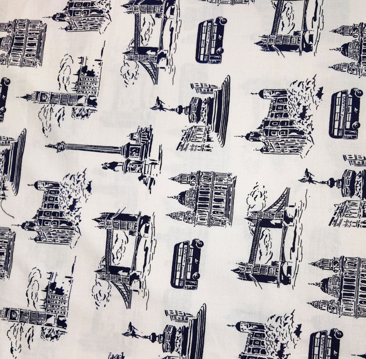 A00298 – Des monuments et bus londoniens dessinés à l’encre noire s’alignent sur fond blanc dans un style rétro.
