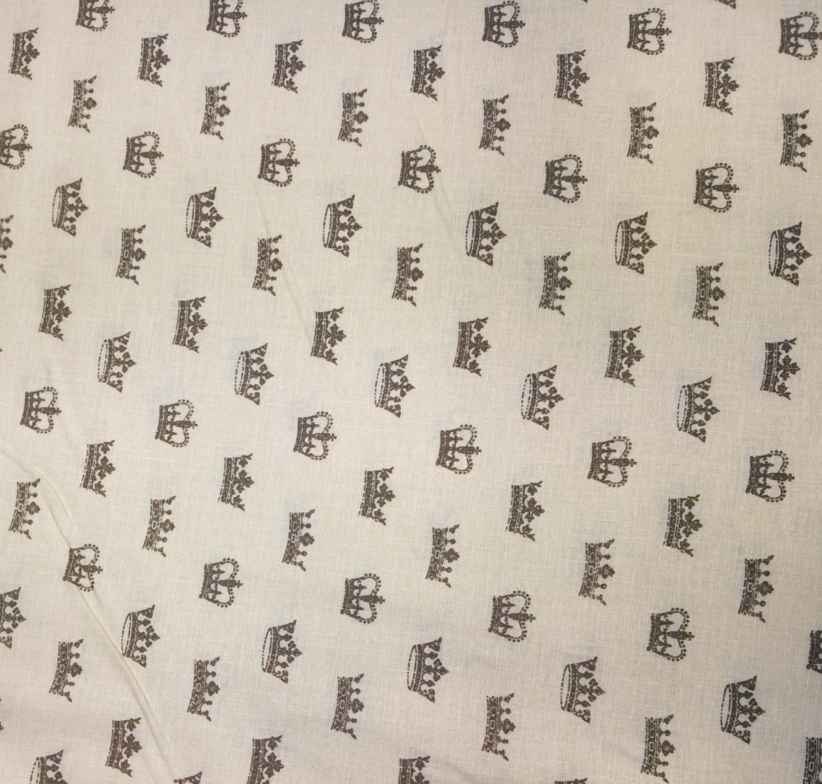 A00299 – De petites couronnes brunes se répètent sur fond beige, évoquant un motif royal au charme ancien.