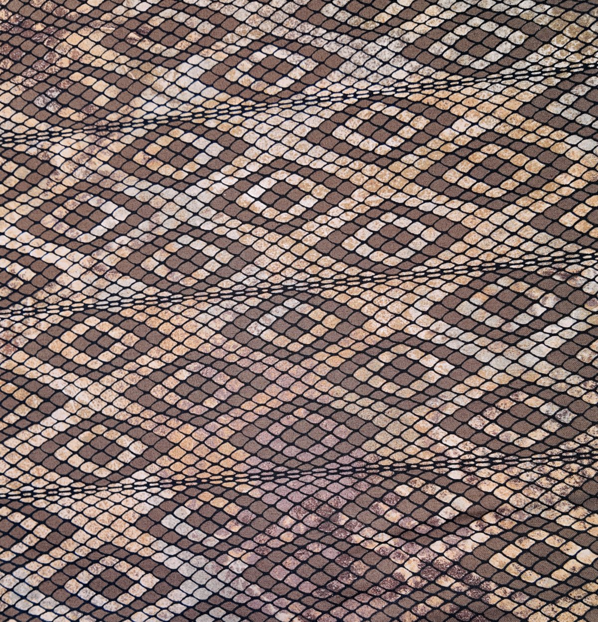 A00304 – Des losanges ondulants s’entrelacent dans une trame rappelant la peau d’un reptile, aux tons chauds de sable, d’ombre et de pierre.