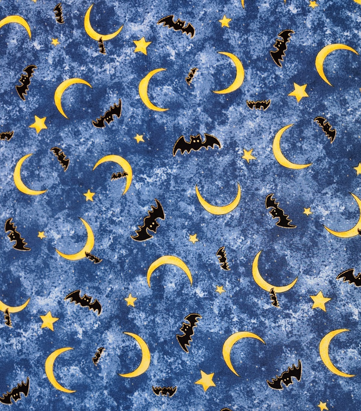 A00305 – Sous un ciel bleu nuit se dessinent des lunes dorées, des étoiles scintillantes et des chauves-souris qui s’élancent dans le silence de l’obscurité.