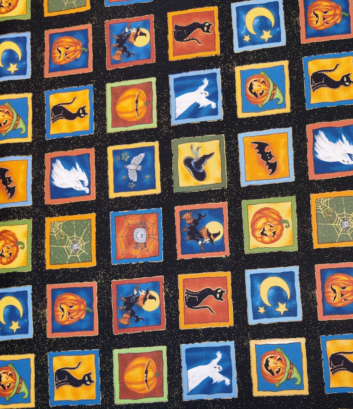 A00306 – Une mosaïque de carrés colorés célèbre Halloween : citrouilles, fantômes, chats noirs et lunes dorées s’y répondent dans un joyeux désordre nocturne.