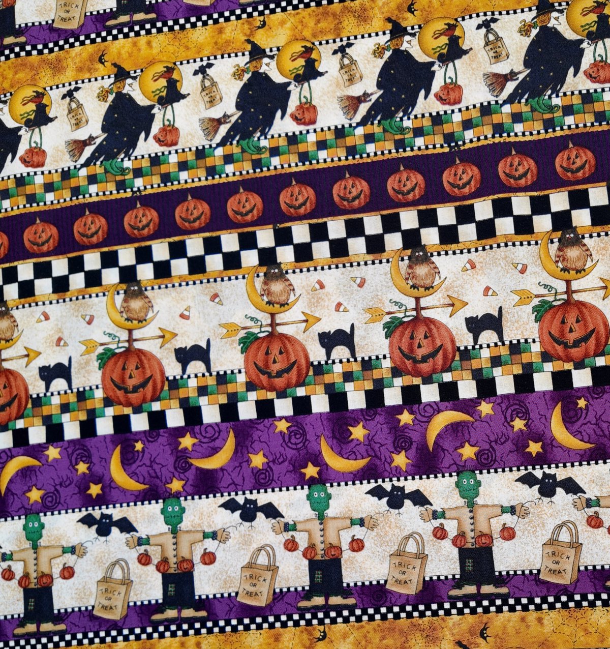 A00311 – Des bandes festives alternant sorcières, citrouilles et lunes dorées, évoquent une joyeuse farandole d’Halloween sous un ciel étoilé.