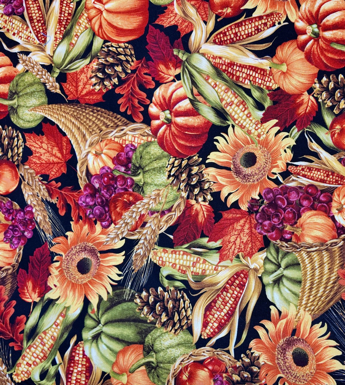 A00312 – Une abondance de fruits d’automne, d’épis et de tournesols rayonne sur fond sombre comme une corne d’abondance éclatante.