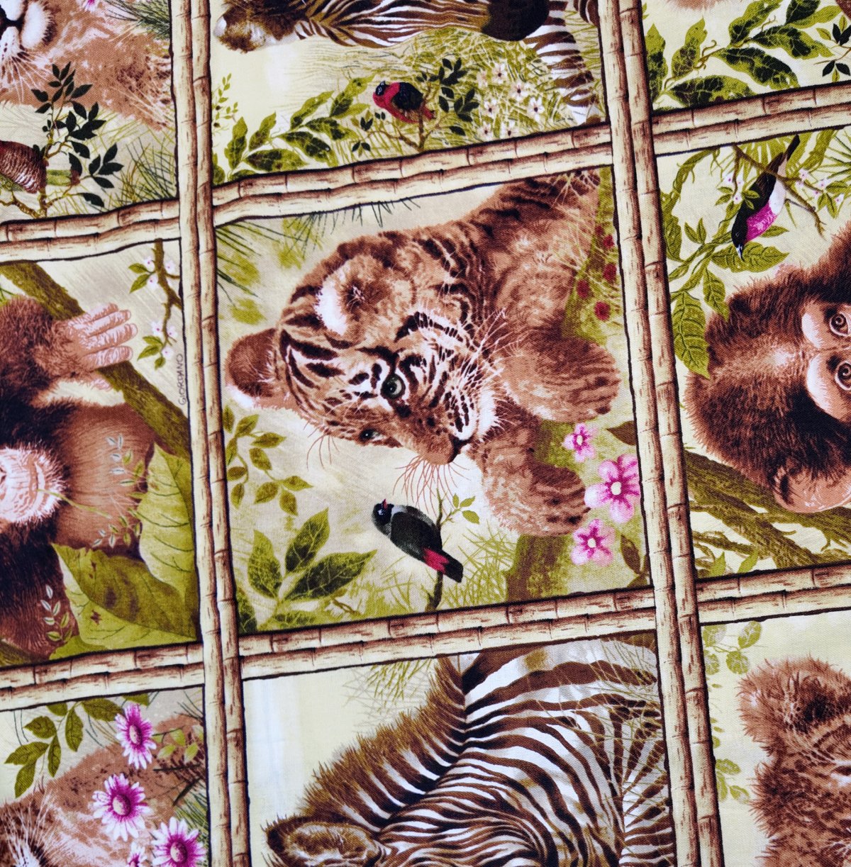 A00327 – Une tendre scène de jungle où tigre, singe et zèbre s’encadrent entre des lianes de bambou. Des oiseaux et des fleurs animent ce décor d’un vert doux et d’un brun doré.