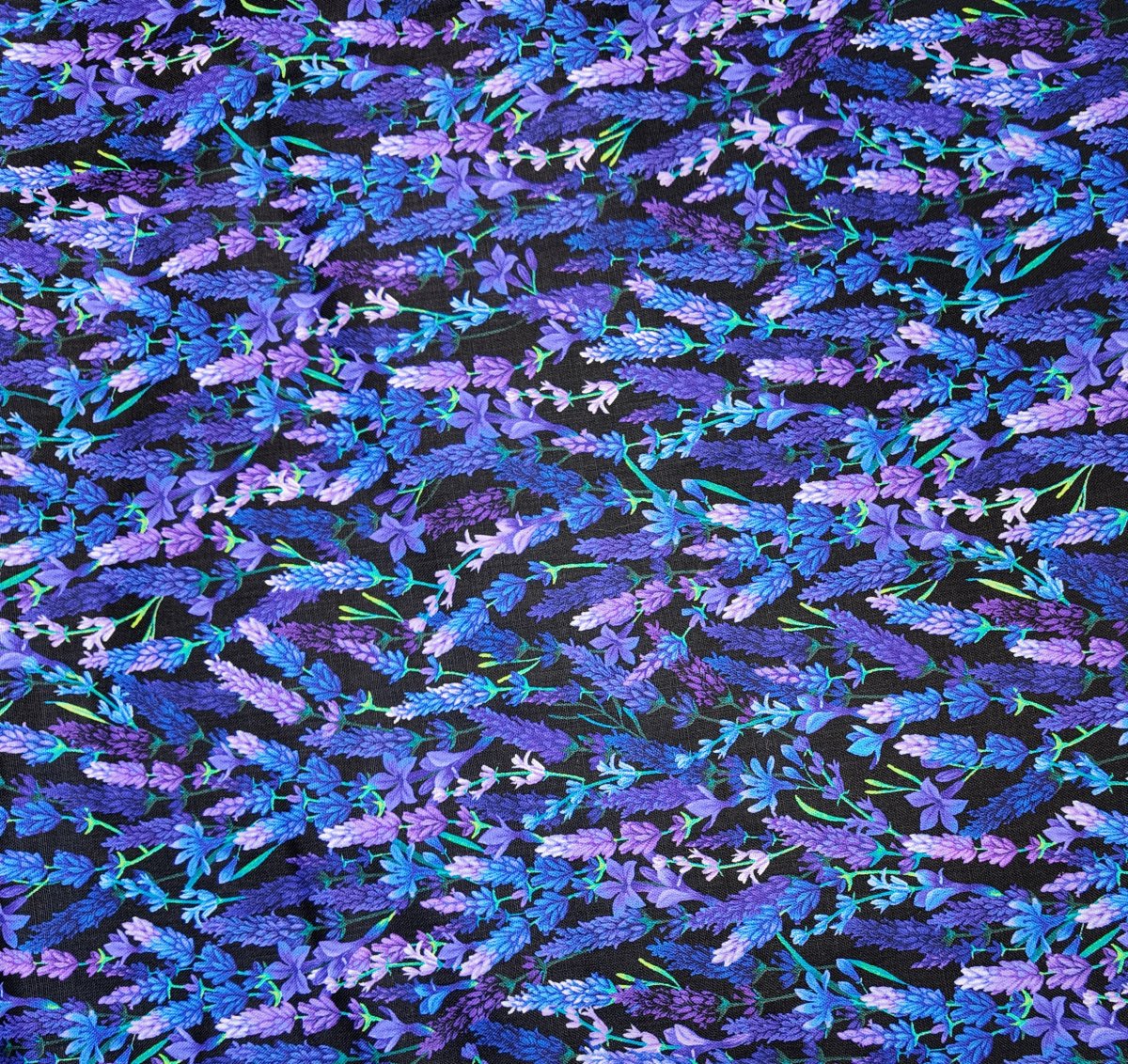 A00331 – Une pluie de petites fleurs bleues et mauves se déploie sur un fond sombre, évoquant un champ de lavande au crépuscule. L’ensemble forme un mouvement léger et parfumé.