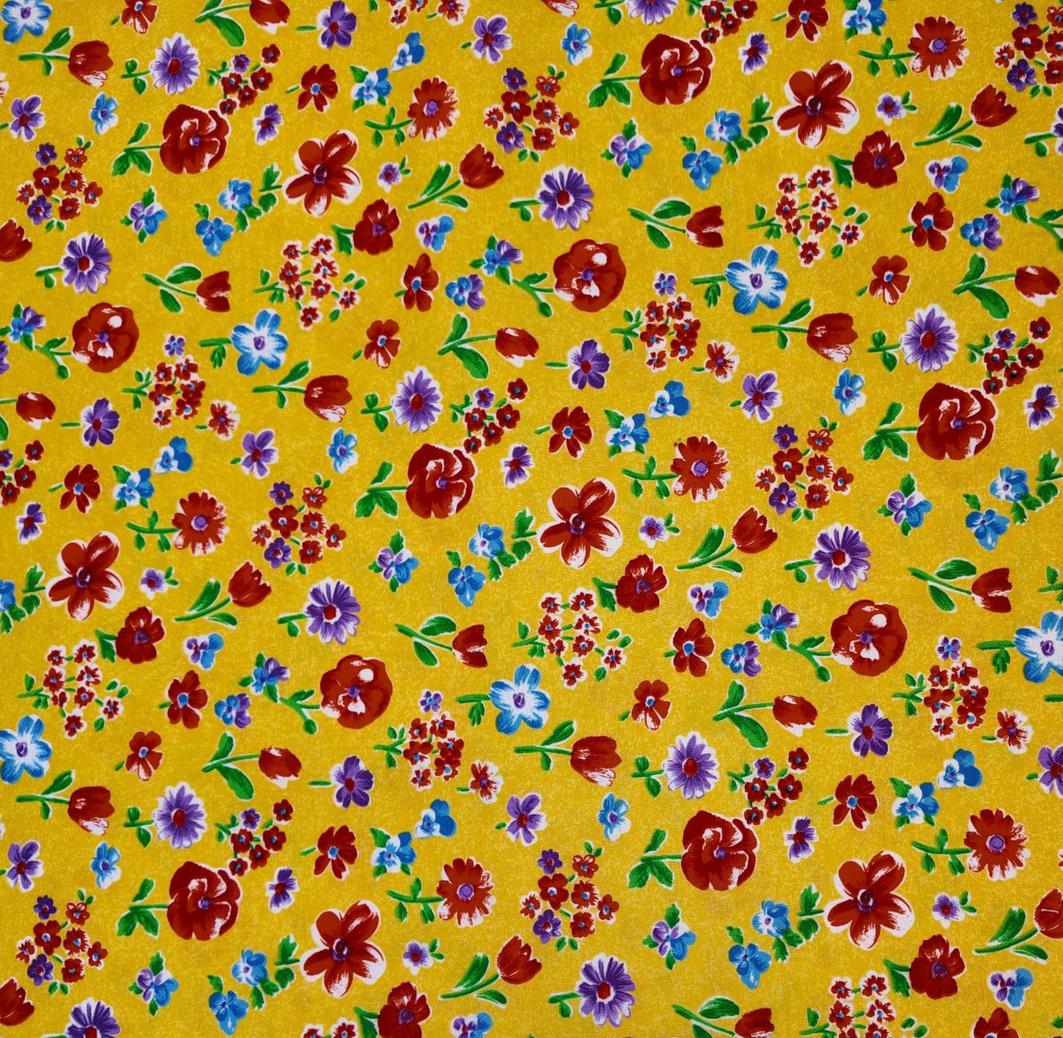 A00340 – Une prairie éclatante s’étale sur fond jaune, où chaque fleur semble chanter l’arrivée du printemps. Les rouges, bleus et violets s’entrelacent dans une danse joyeuse, ponctuée de feuillages verts comme des éclats de fraîcheur. Ce tissu rayonne d’énergie florale, une fête visuelle qui invite à la légèreté.