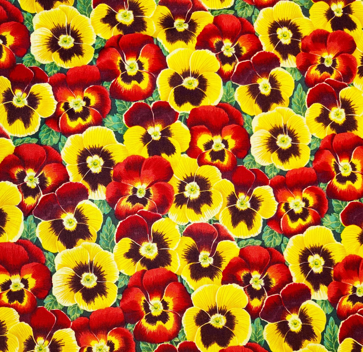 A00344 – Pensées généreuses aux pétales rouges et jaunes, serrées en un tapis riche où les cœurs sombres créent des accents profonds. Le grand motif floral dégage une énergie éclatante et une présence affirmée. Imprimé dense, luxuriant et botanique.