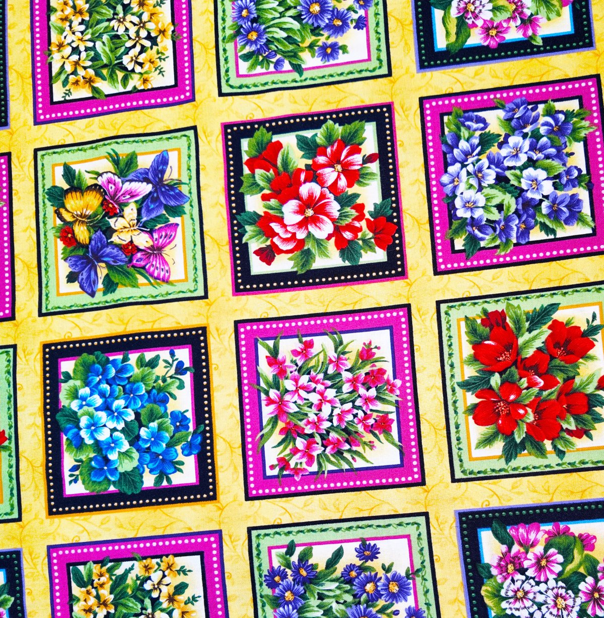 A00346 – Vignettes encadrées disposées en damier sur un fond jaune, chacune contenant un bouquet peint aux couleurs vives. L'ensemble joue la carte du panneau décoratif lumineux, rythmé par des cadres colorés et des compositions botaniques. Motif moyen, structuré et répétitif.