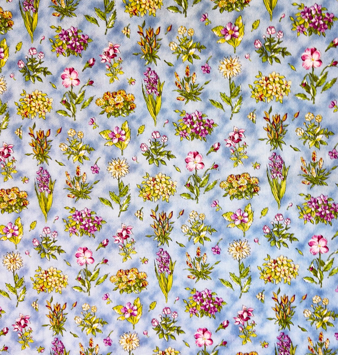 A00350 – Un ciel d’aquarelle bleue sert de toile à de petits bouquets champêtres, peints de mauve, rose et vert tendre. Le motif respire la campagne, doux et enjoué, comme un herbier léger sur fond vaporeux. Motif petit et espacé.