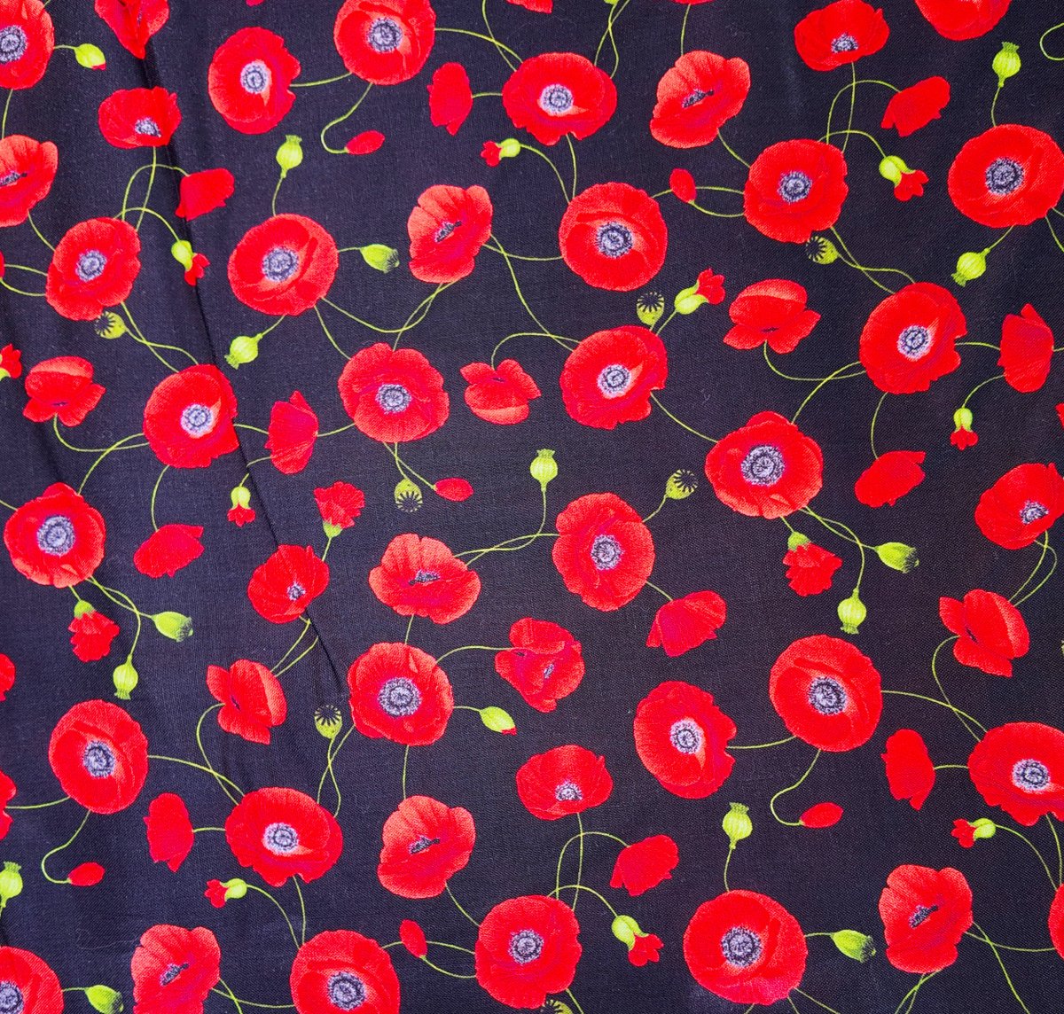 A00352 – Des coquelicots éclatants se détachent sur un fond noir profond, reliés par de fines tiges vert tendre. Le motif respire la liberté des champs d’été, entre éclat et légèreté. Motif moyen, floral et rythmé.