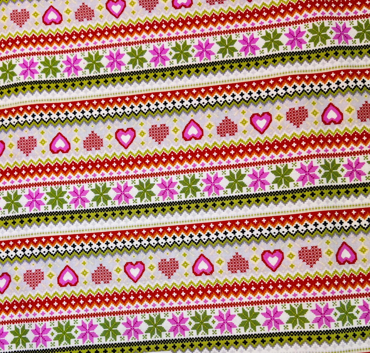 A00359 – Bandes obliques alternant cœurs, flocons et rosaces dans une palette vive de rose, vert, rouge et or. L’ensemble rappelle un tricot festif ou une bordure nordique, rythmée et joyeuse. Motif moyen et répétitif.