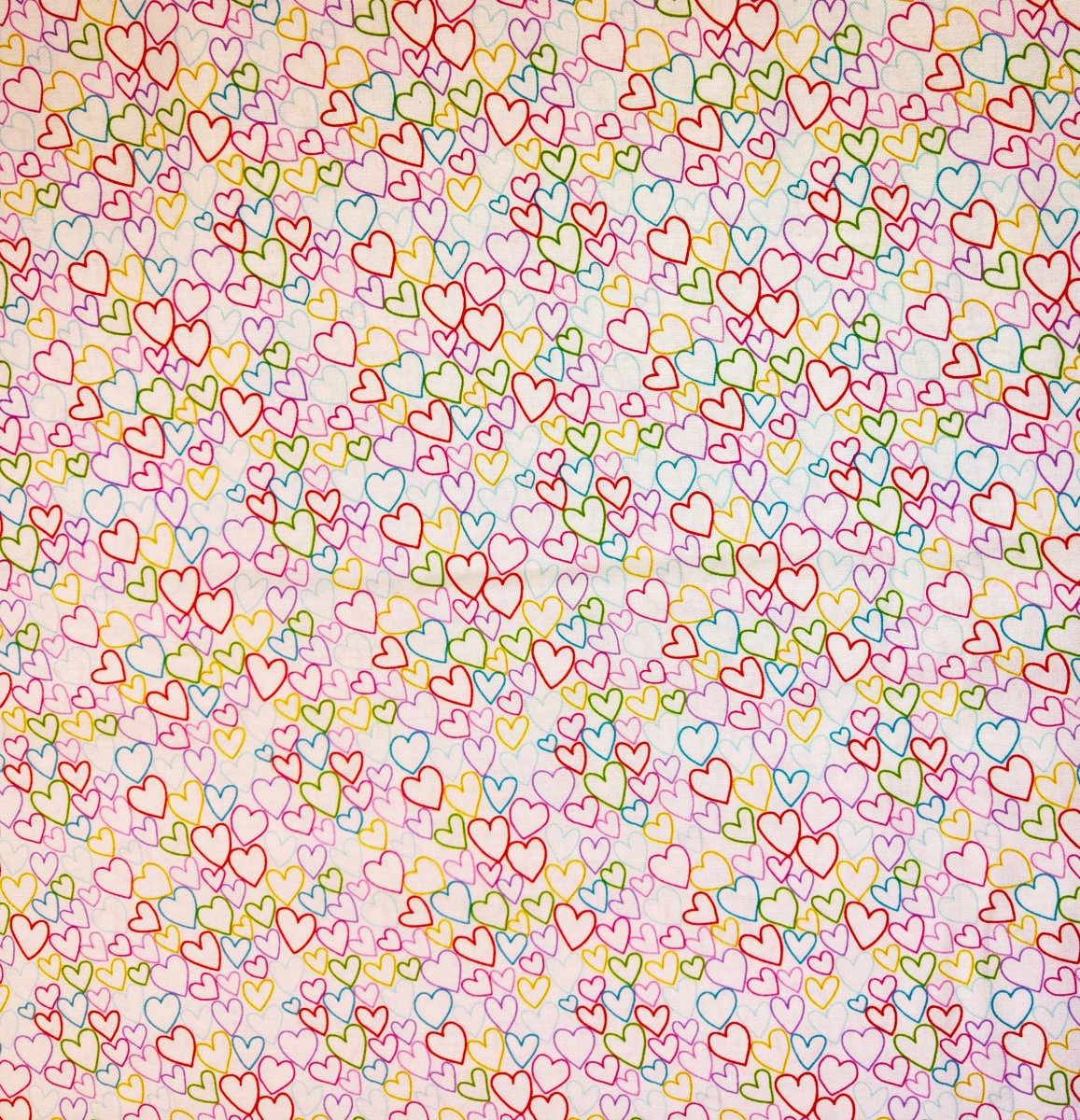 A00362 – Sur fond blanc, un enchevêtrement de cœurs multicolores forme un réseau joyeux et dynamique. Les contours fins évoquent une légèreté espiègle, entre spontanéité et douceur. Motif petit et continu.