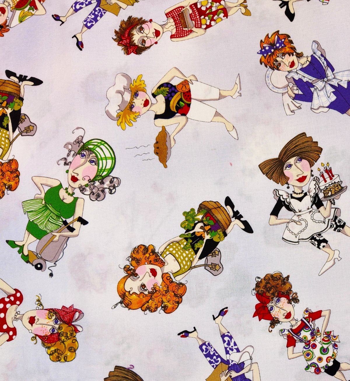 A00368 – Des personnages féminins caricaturaux se promènent sur fond clair, chacune exprimant une fantaisie vive et pleine d’humour. Le dessin joue avec les postures et les couleurs pour un effet théâtral. Motif moyen et figuratif.
