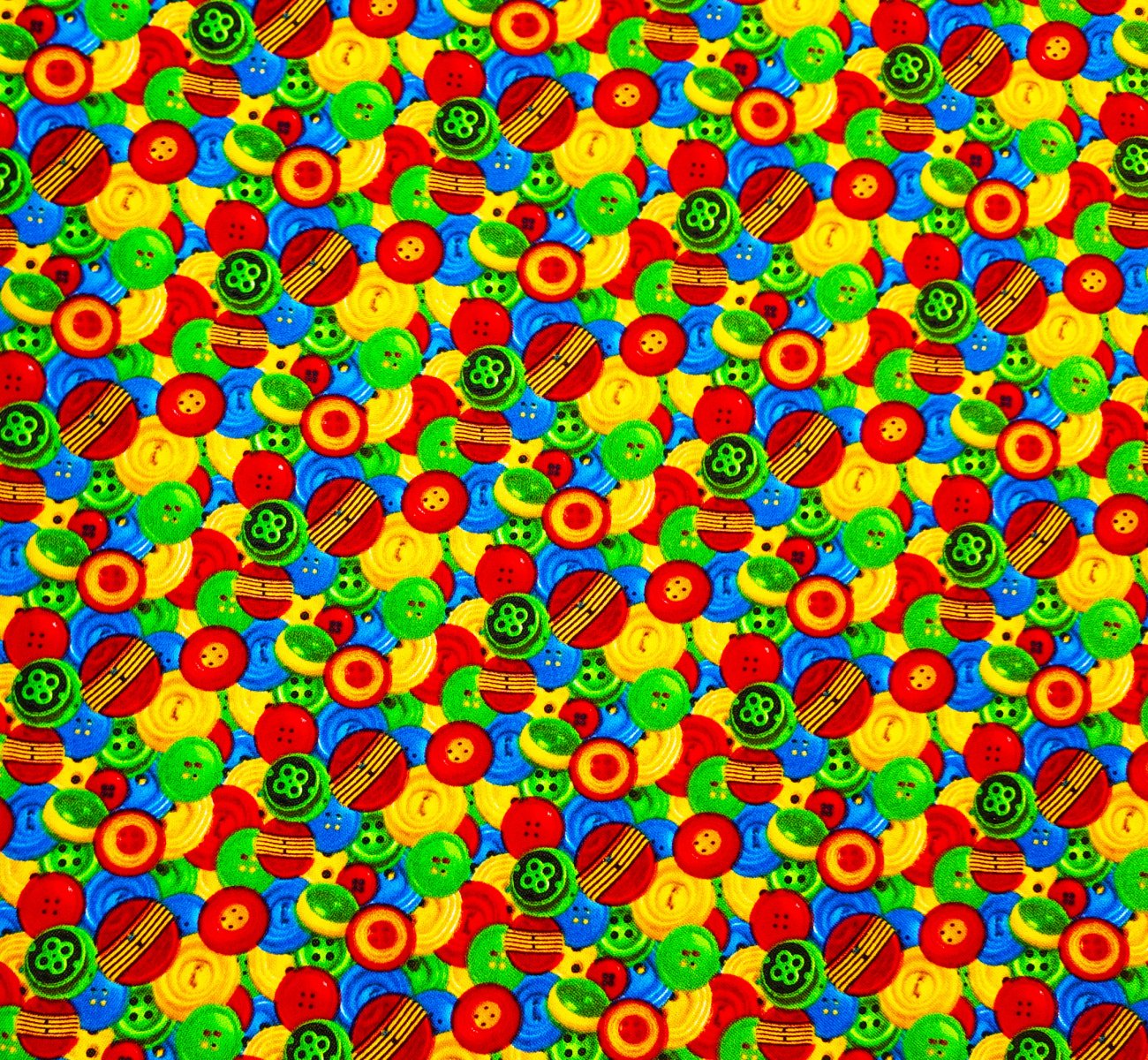 A00370 – Une mosaïque éclatante de boutons multicolores se superpose dans un joyeux désordre. Rouge, vert, jaune et bleu s’y répondent comme des confettis textiles. Motif petit et vibrant.