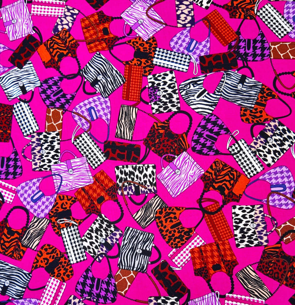 A00372 – Un fond fuchsia éclatant couvert de sacs à main imprimés de motifs animaliers et graphiques. Le tissu respire la mode audacieuse et l’énergie urbaine. Motif moyen et répétitif.