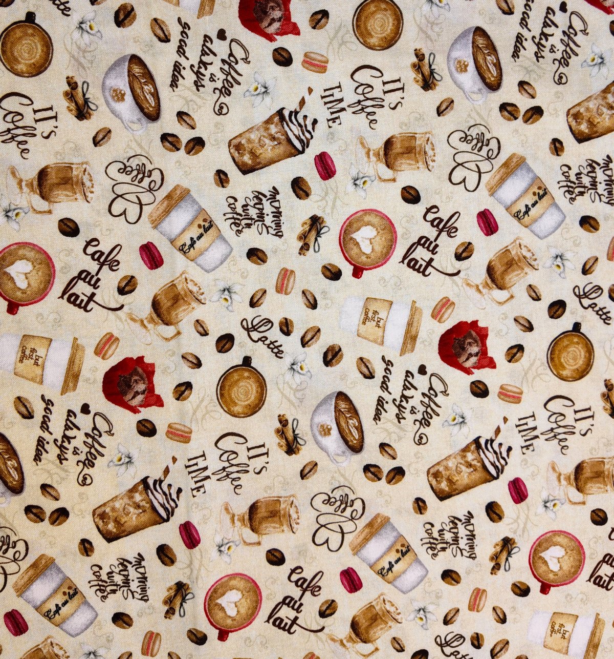 A00391 – Sur un fond beige doux, cafés, tasses et grains se mêlent à des inscriptions manuscrites. L’ensemble évoque la chaleur d’un café du matin et le parfum torréfié. Motif moyen et harmonieux.