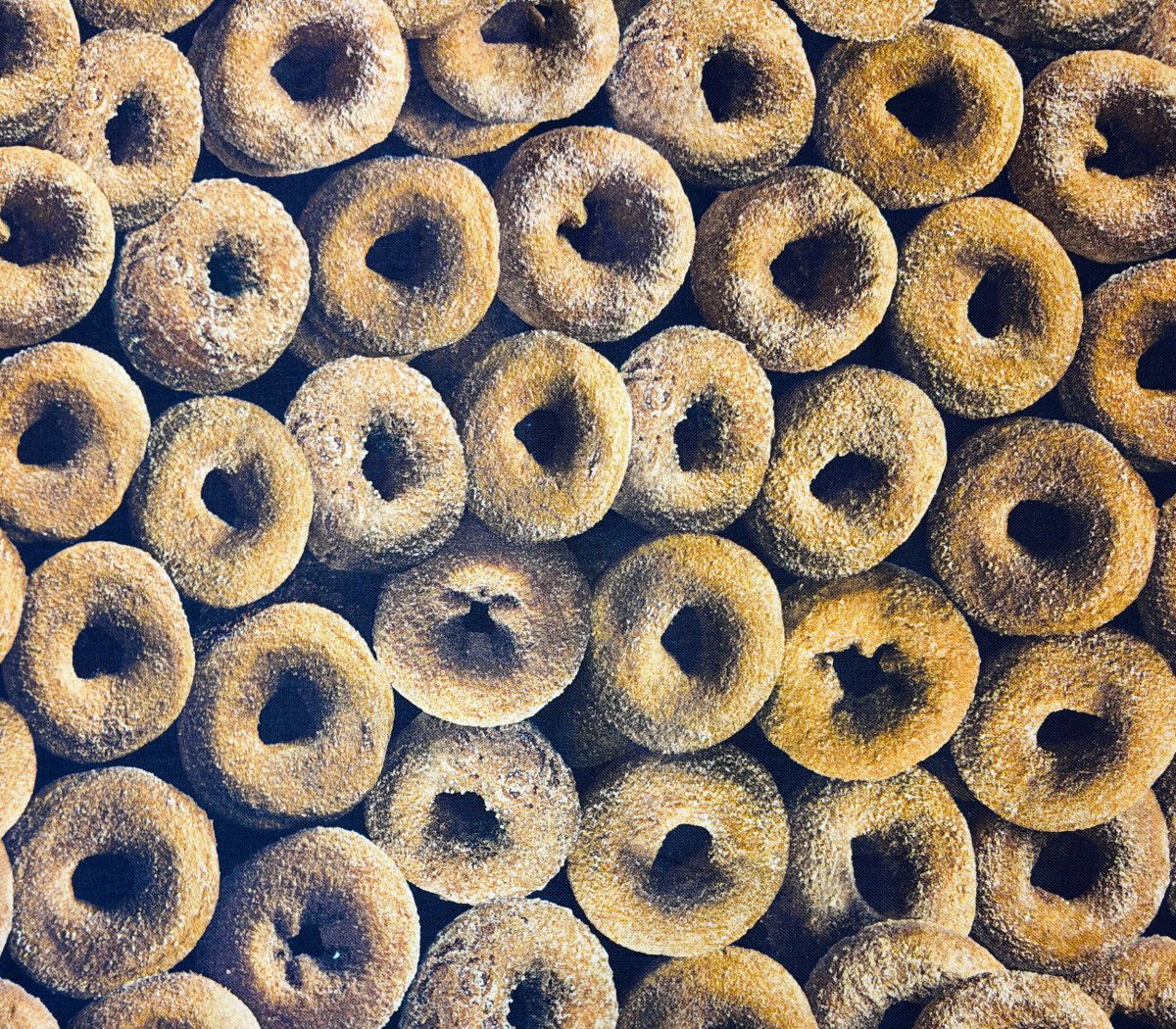 A00394 – Une succession de beignets dorés forme une texture appétissante et moelleuse. Le contraste des ombres et de la farine évoque la chaleur d’une pâtisserie. Motif moyen et régulier.