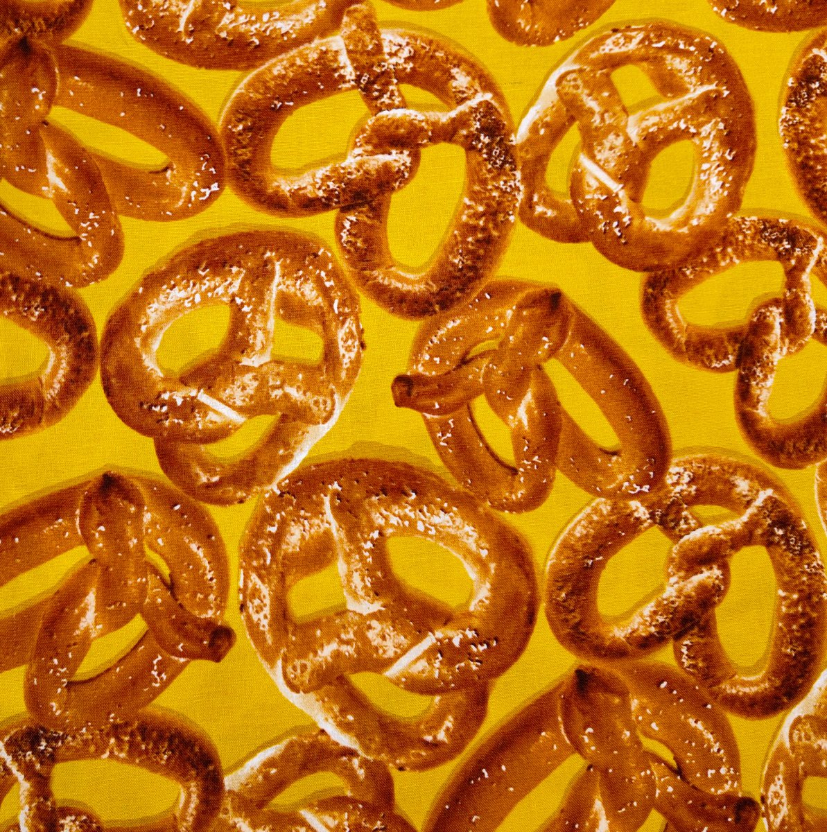 A00395 – De grands bretzels dorés se détachent sur un fond jaune lumineux. Leur brillance salée évoque la chaleur d’une boulangerie d’automne et la convivialité d’une fête. Motif moyen et appétissant.