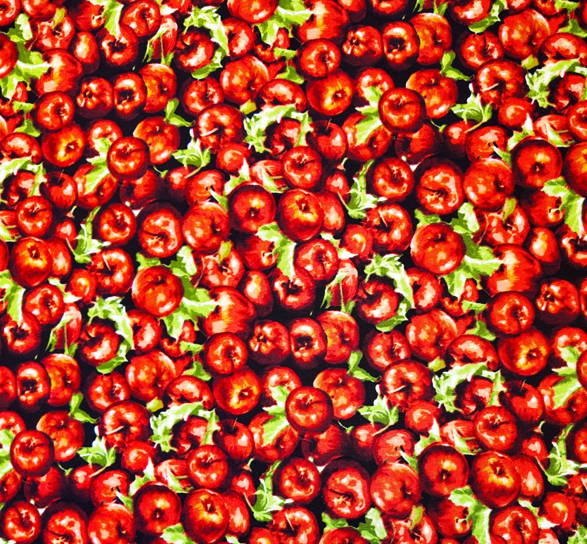 A00400 – Des pommes rouge carmin s’amoncellent dans une lumière chaude, ponctuées de feuilles vertes comme un souffle de verger. Le tissu évoque la cueillette, la plénitude et la douceur sucrée de l’automne.