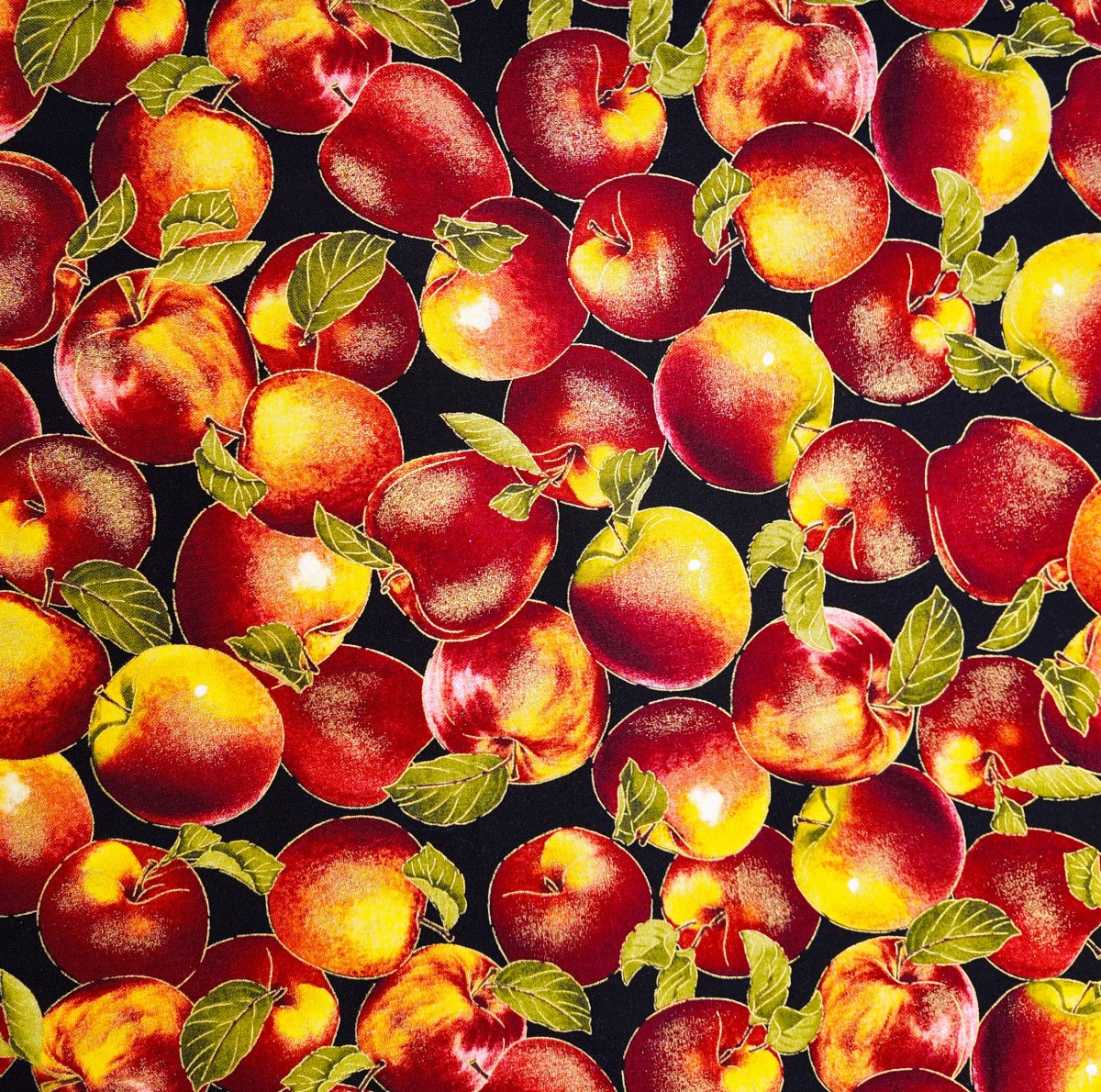 A00401 – Des pommes rondes et dorées se mêlent au rouge profond des fruits mûrs. Ce tissu rayonne d’un éclat solaire, rappelant les vergers baignés de lumière et la générosité de la saison des récoltes.