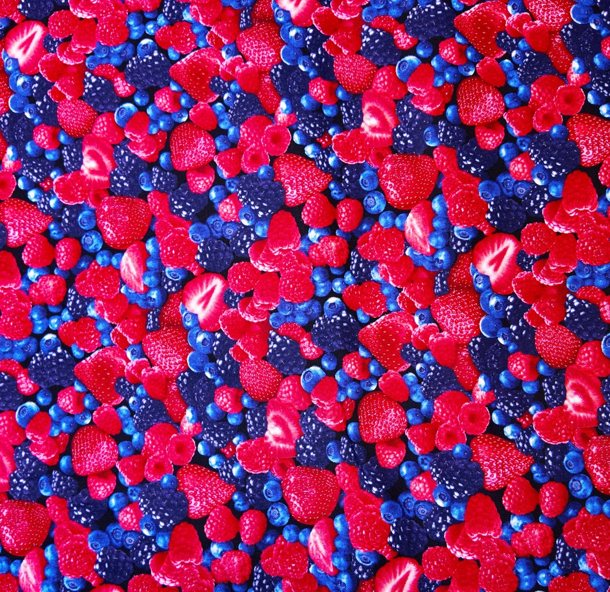 A00404 – Une mosaïque de fruits rouges et bleus tapisse le tissu, mélange vibrant de fraises, mûres et myrtilles. Ce motif exhale la fraîcheur acidulée des sous-bois d’été et la richesse des récoltes ensoleillées.