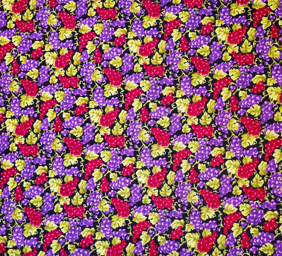 A00412 – Des grappes de raisin rouge et violet s’épanouissent parmi des feuilles dorées. Ce tissu évoque la richesse des vendanges et la chaleur des fins d’été baignées de lumière.