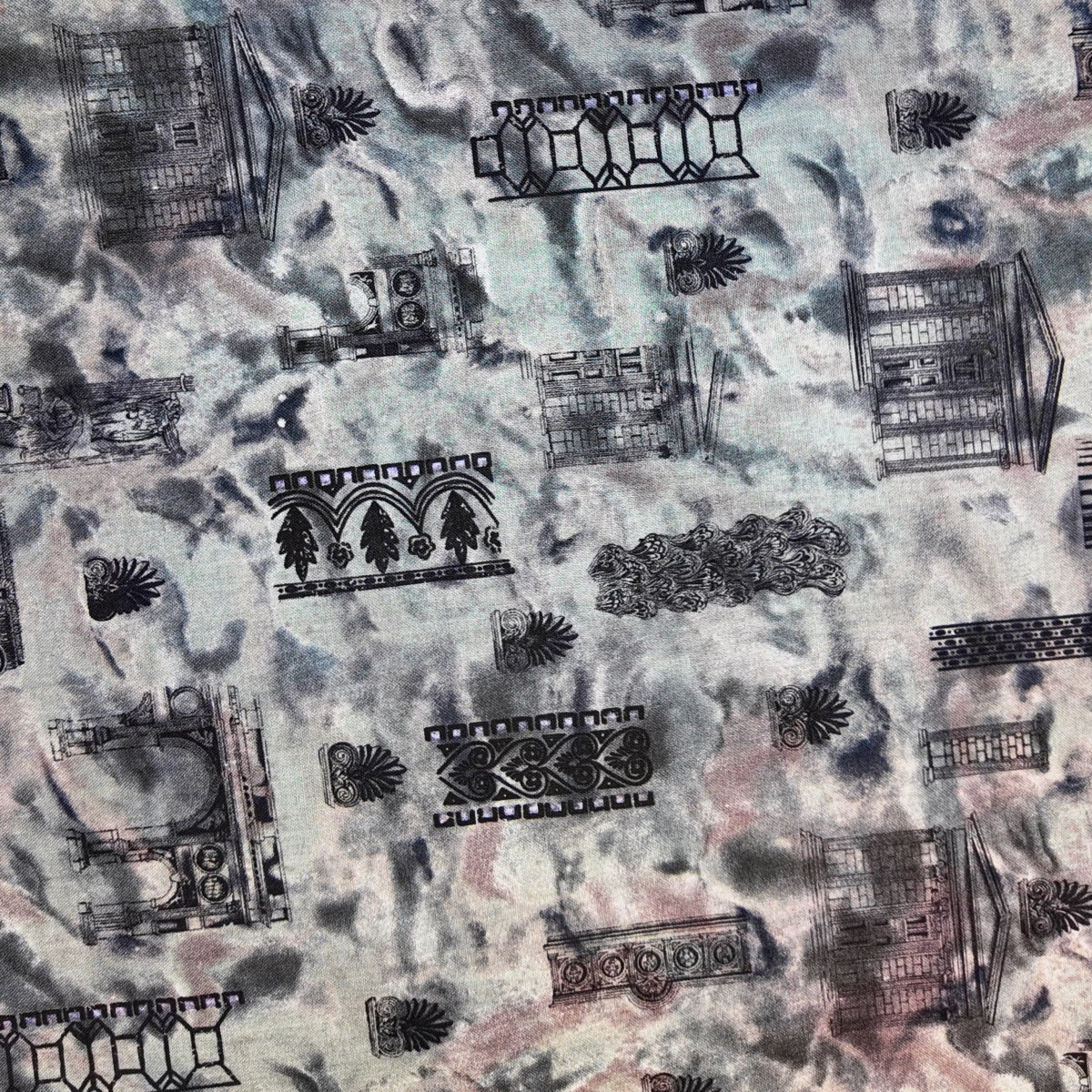 A00429 – Des esquisses architecturales se fondent sur un fond nuageux gris bleuté. Le tissu évoque la mémoire des pierres anciennes, entre plans d’époque et brumes urbaines.