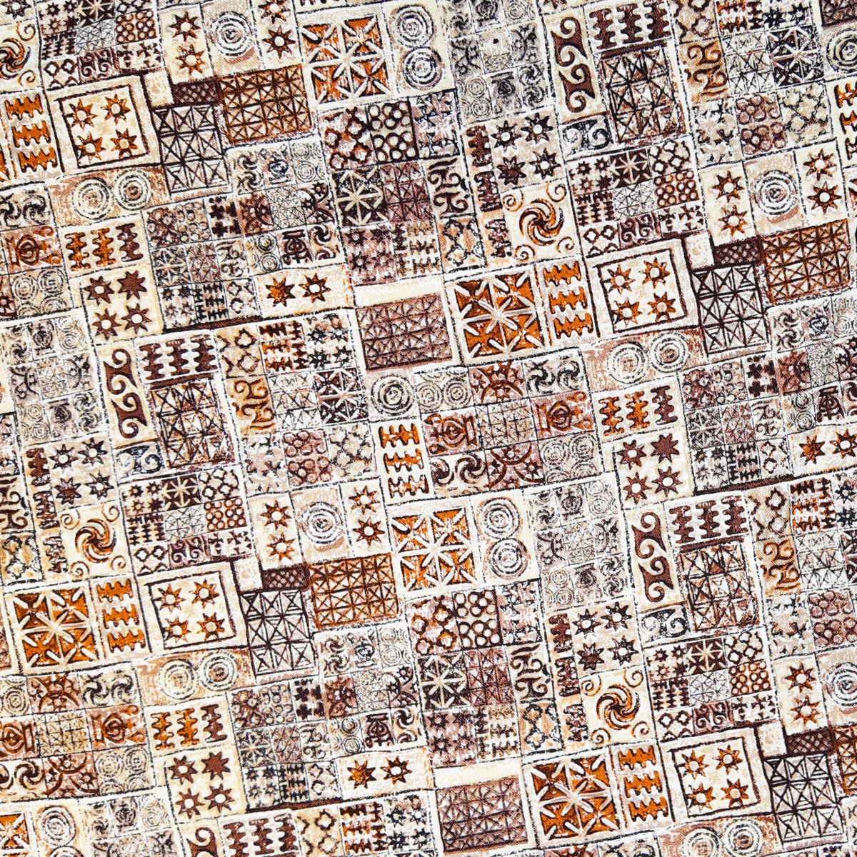 A00430 – Un patchwork d’empreintes ocre et brunes dessine une mosaïque de symboles géométriques. Le tissu respire la chaleur de la terre et la force des traditions artisanales.
