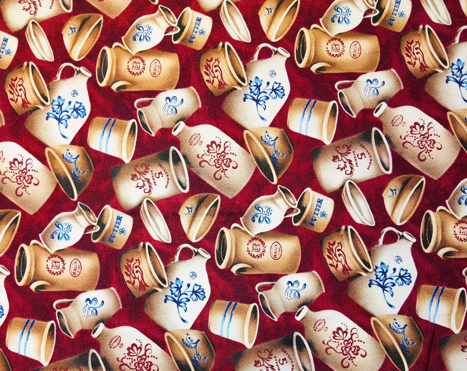A00431 – Des pots de grès crème décorés de motifs bleus et rouges se détachent sur un fond rouge profond. Le tissu rappelle les marchés anciens et le charme des poteries d’atelier.