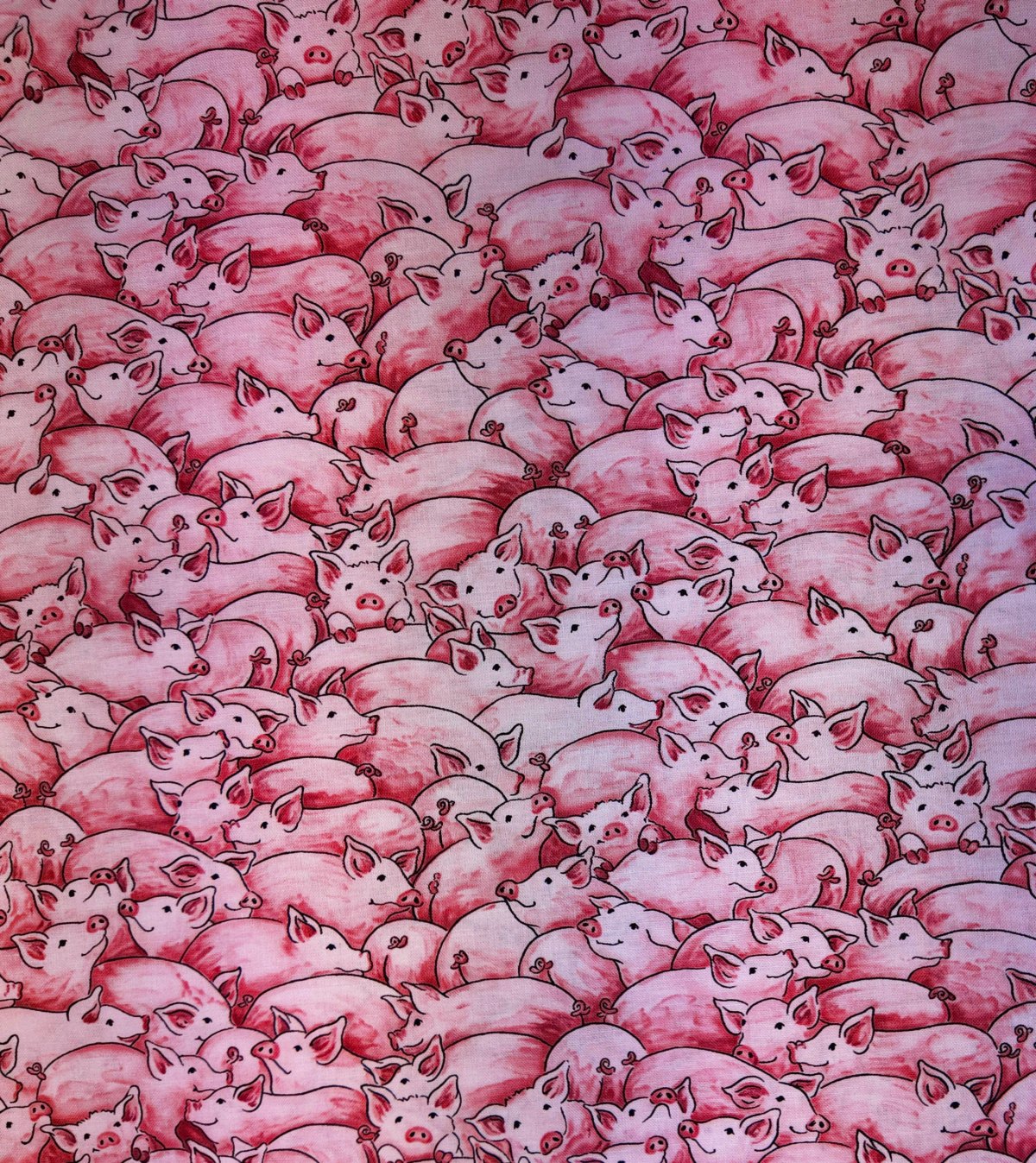 A00440 – Une mer de petits cochons roses esquissés à l’encre rouge crée une fresque joyeuse et pleine de mouvement. Le tissu respire la fantaisie et la tendresse.