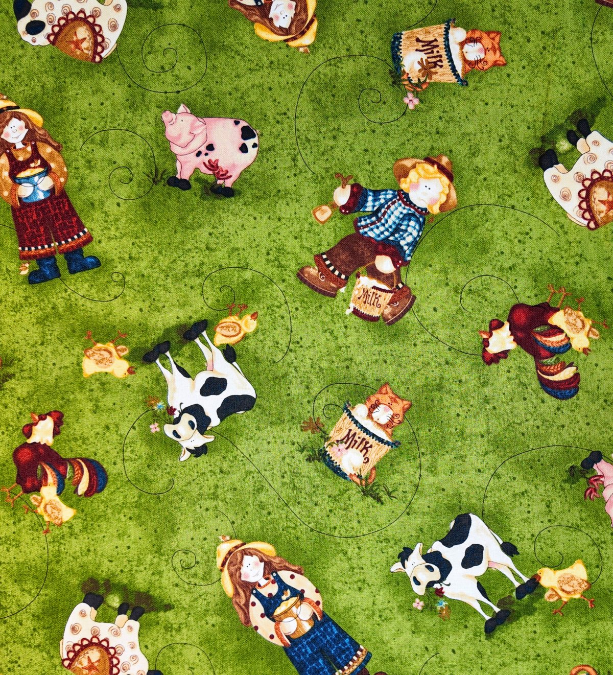 A00442 – Des scènes champêtres s’éparpillent sur un fond vert tendre : fermiers, animaux et bottes de lait se côtoient joyeusement. Le tissu respire la vie simple et colorée des fermes d’enfance.