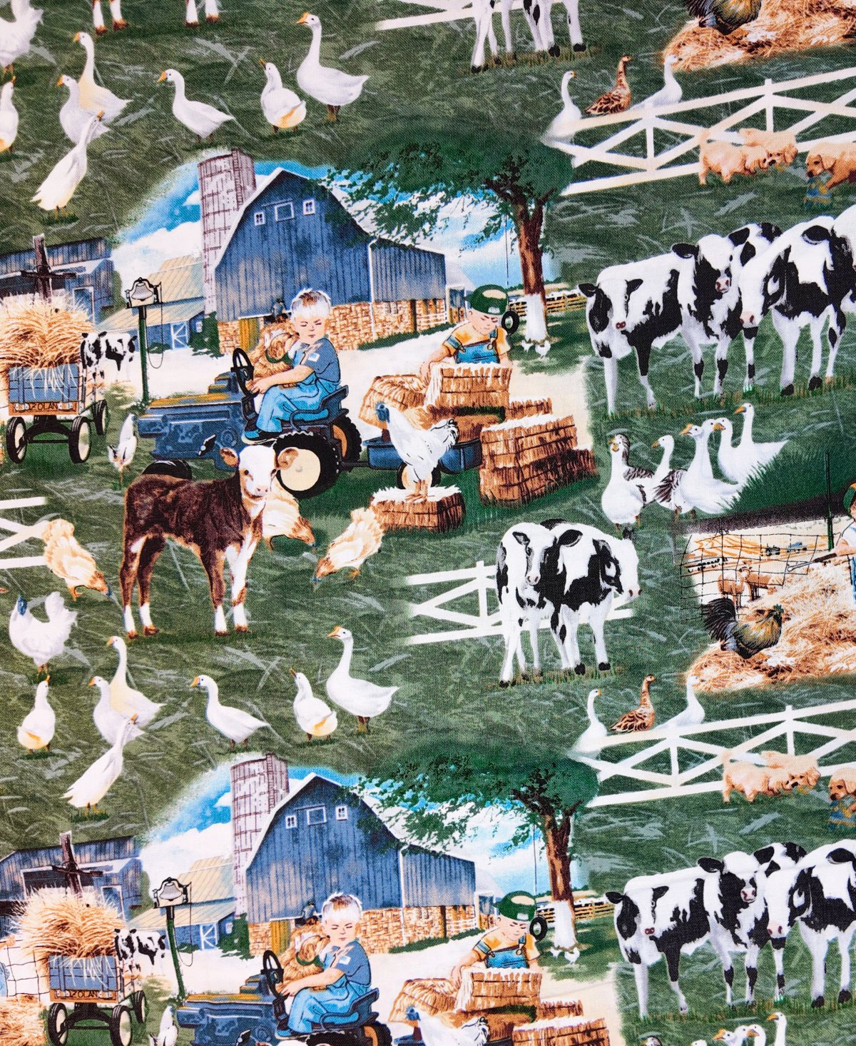A00445 – Des scènes de ferme animées montrent enfants, veaux et oies sous le soleil d’été. Le tissu respire la tendresse rustique et la vie paisible des champs.