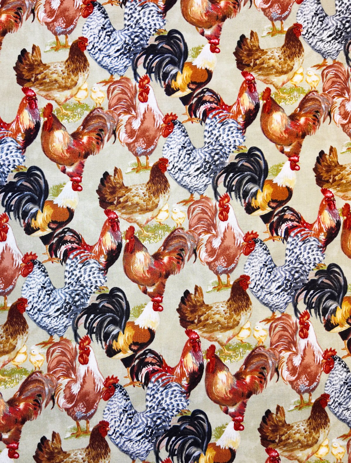 A00455 – Coqs et poules aux plumes éclatantes animent un fond clair. Le tissu vibre de vie et de couleurs, comme une basse-cour en plein éveil.