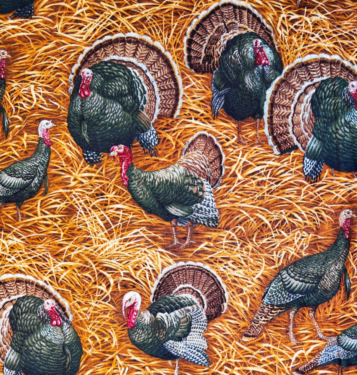 A00460 – De majestueux dindons se pavanent dans une mer de paille dorée. Le tissu évoque la richesse automnale et la vie tranquille des granges.