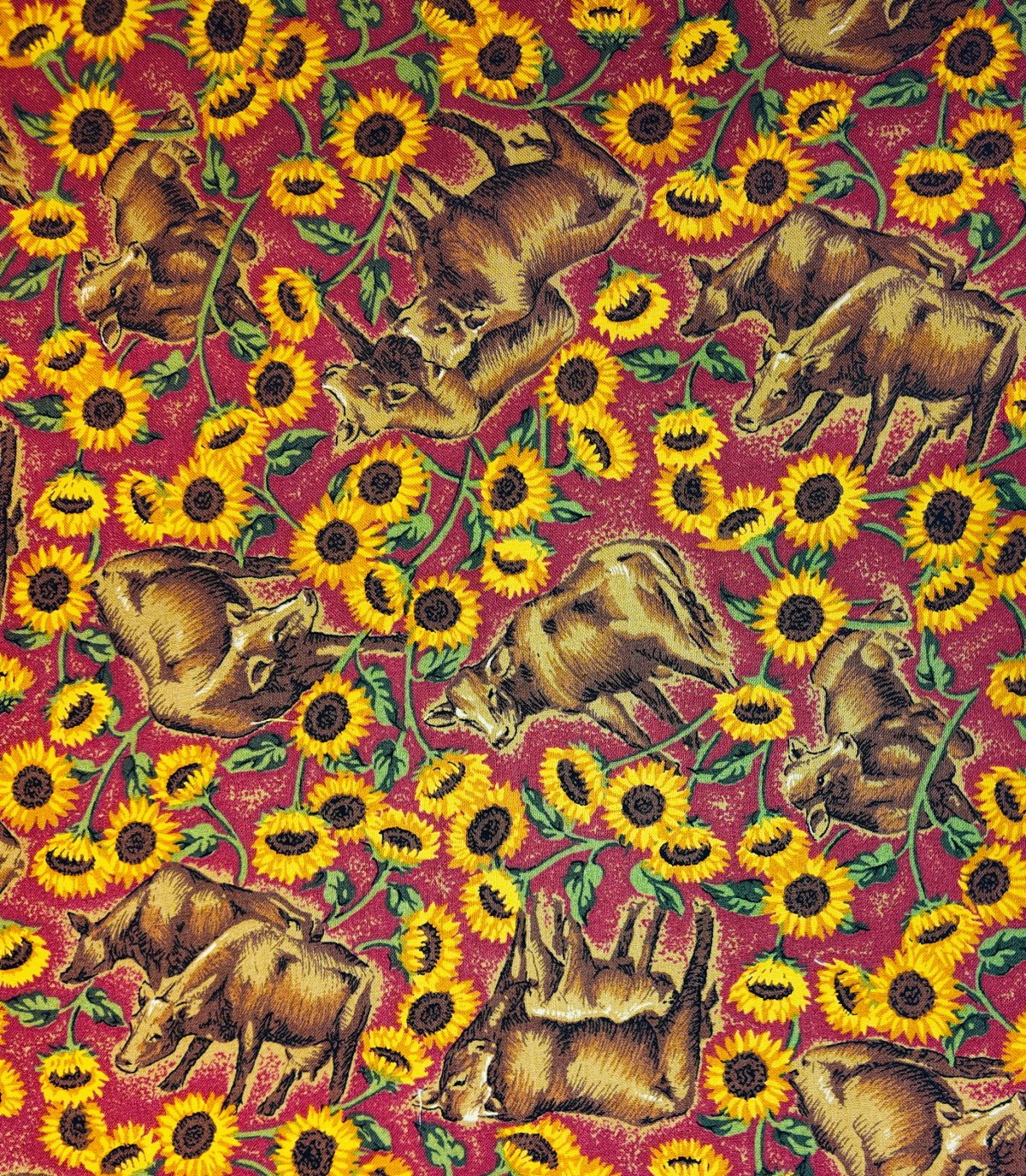 A00467 – Des vaches brunes paissent parmi un champ éclatant de tournesols sur fond rouge profond. Le tissu rayonne d’une chaleur estivale et d’un parfum de campagne.
