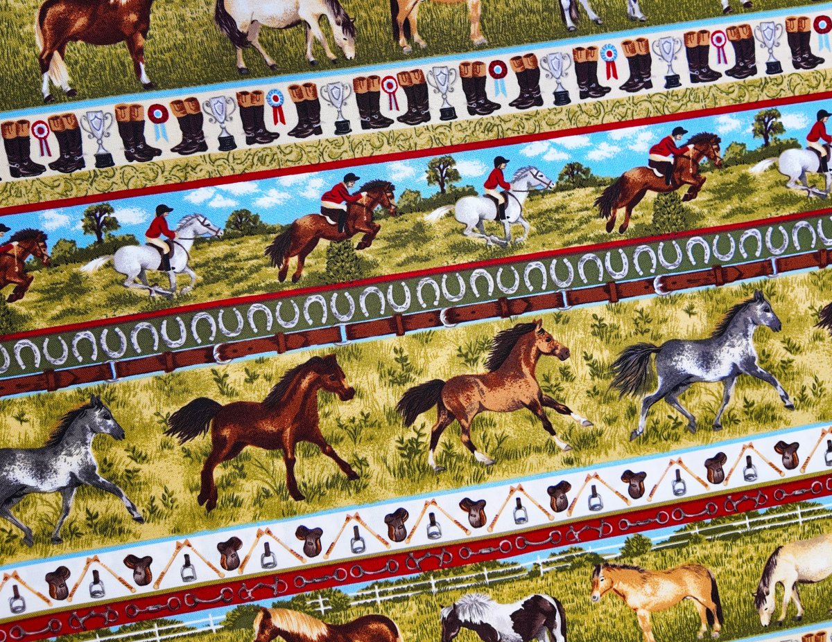 A00479 – Cavaliers, chevaux et accessoires de concours s’alignent en bandes colorées. Le tissu célèbre l’esprit sportif et la beauté du monde équestre.