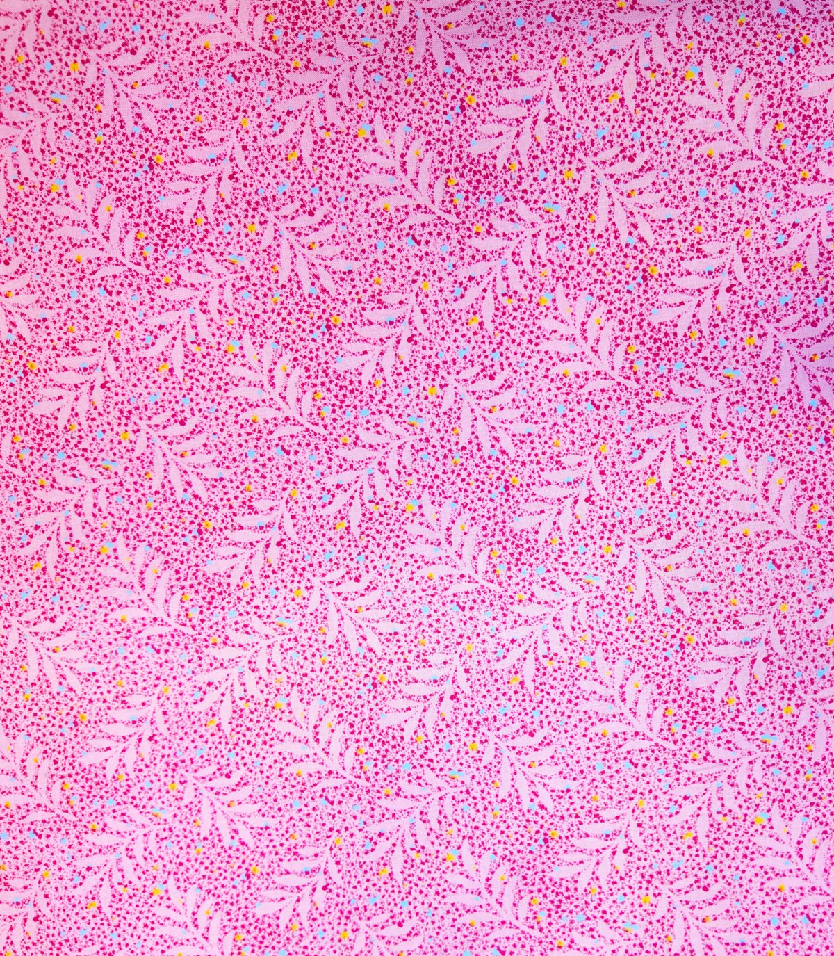 A00485 – Une pluie de petites feuilles et fleurs fuchsia parsème un fond rosé éclatant. Le tissu respire la joie et la légèreté d’un matin printanier.