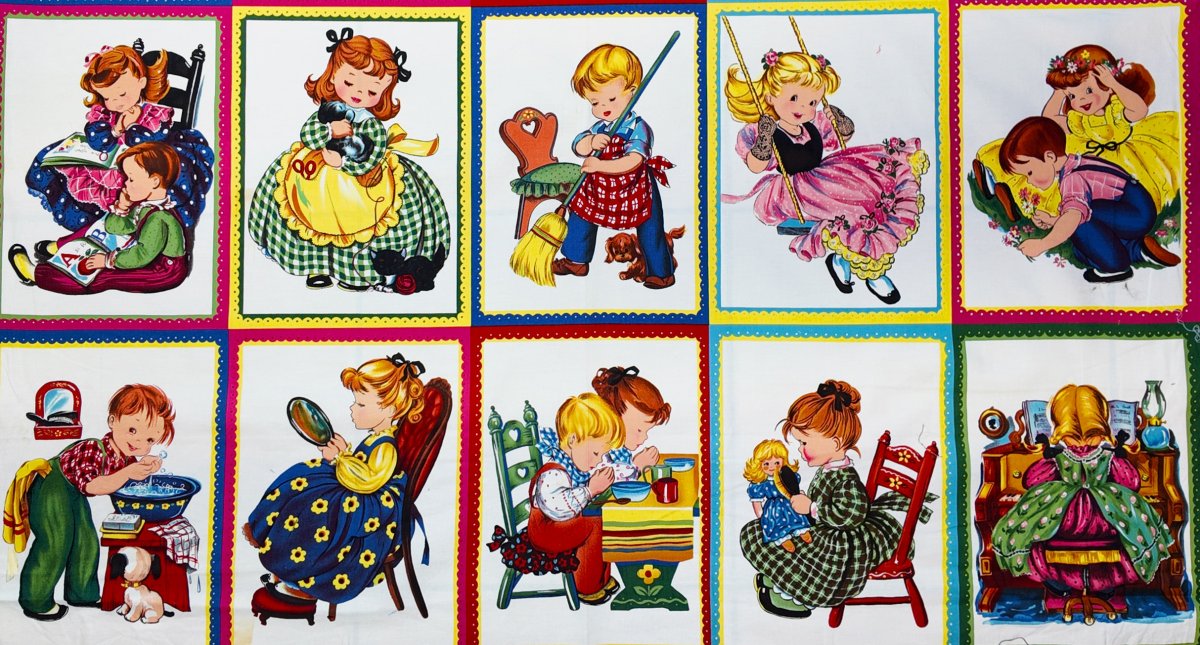 DECOU-011 – Tissu illustré de charmantes scènes d’enfants aux couleurs tendres et vintage. Chaque vignette évoque l’innocence, les jeux et la douceur du quotidien, comme une tendre madeleine d’enfance.