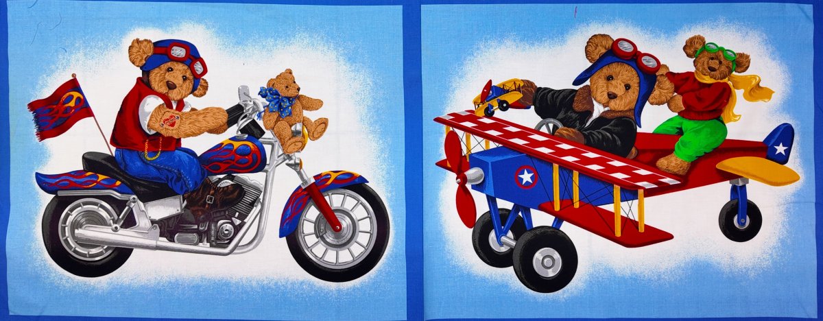 DECOU-016 – Deux oursons intrépides sillonnent le ciel et la route : l’un à moto, l’autre en avion. Le bleu éclatant du fond souligne la fantaisie et l’esprit d’aventure de cette scène pleine d’énergie et de complicité.