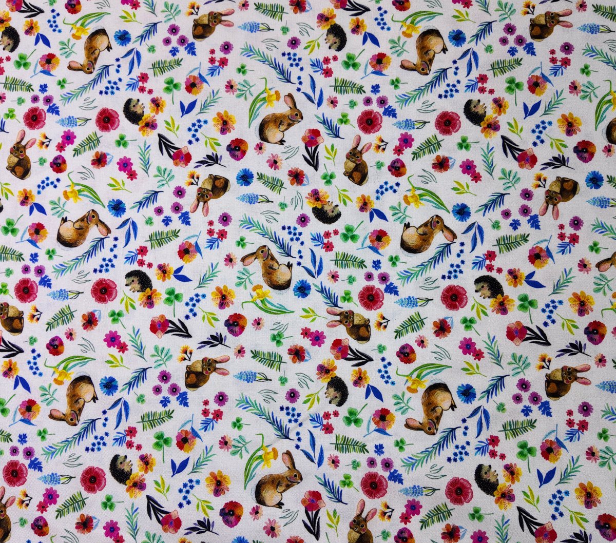 IMPRI-001 – Sur un fond clair, lapins et hérissons gambadent parmi une prairie fleurie éclatante. Ce tissu respire la joie printanière et la douceur champêtre d’un matin ensoleillé.