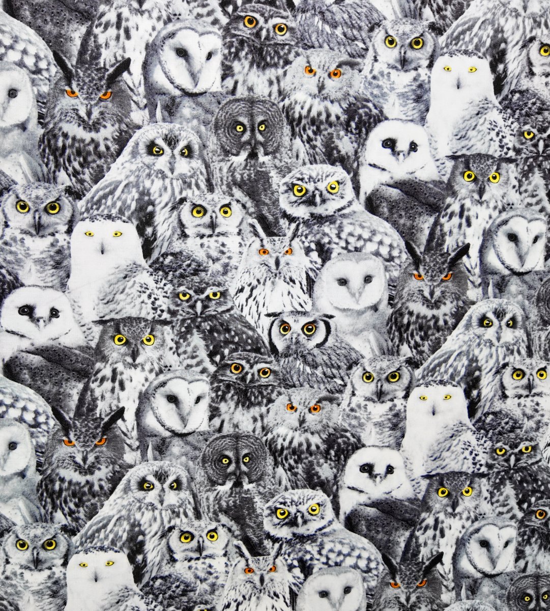 IMPRI-005 – Une forêt d’yeux dorés et de plumes grises se mêle dans une composition fascinante de hiboux. Ce tissu captive par son intensité et son charme mystérieux.
